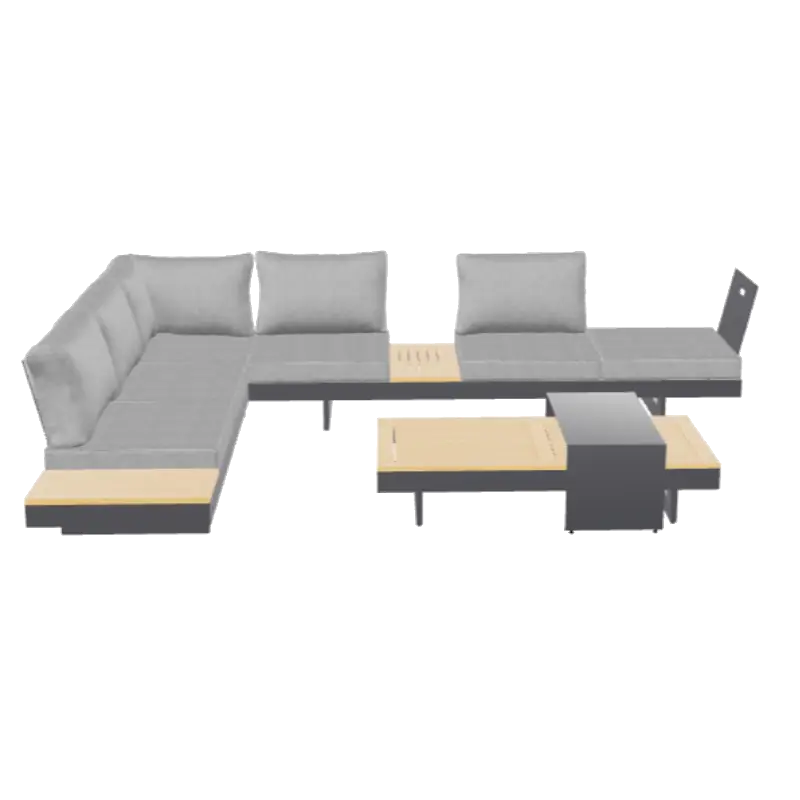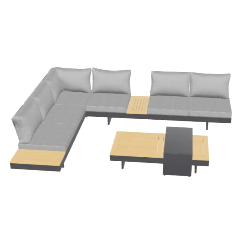 Un set de sillones de exterior diseñado para resistir el clima y acompañar cada momento al aire libre. Con estructura de aleación de aluminio, detalles en madera certificada y cojines de tejido impermeable, ofrece la combinación perfecta entre diseño, durabilidad y confort.